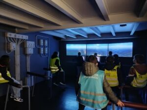 Après notre pique-nique à la base nous nous sommes immergés dans les grands paquebots. Sur le pont nous avons aperçu l’horizon et nous avons essayé le système de messagerie du paquebot et même dirigé le paquebot !