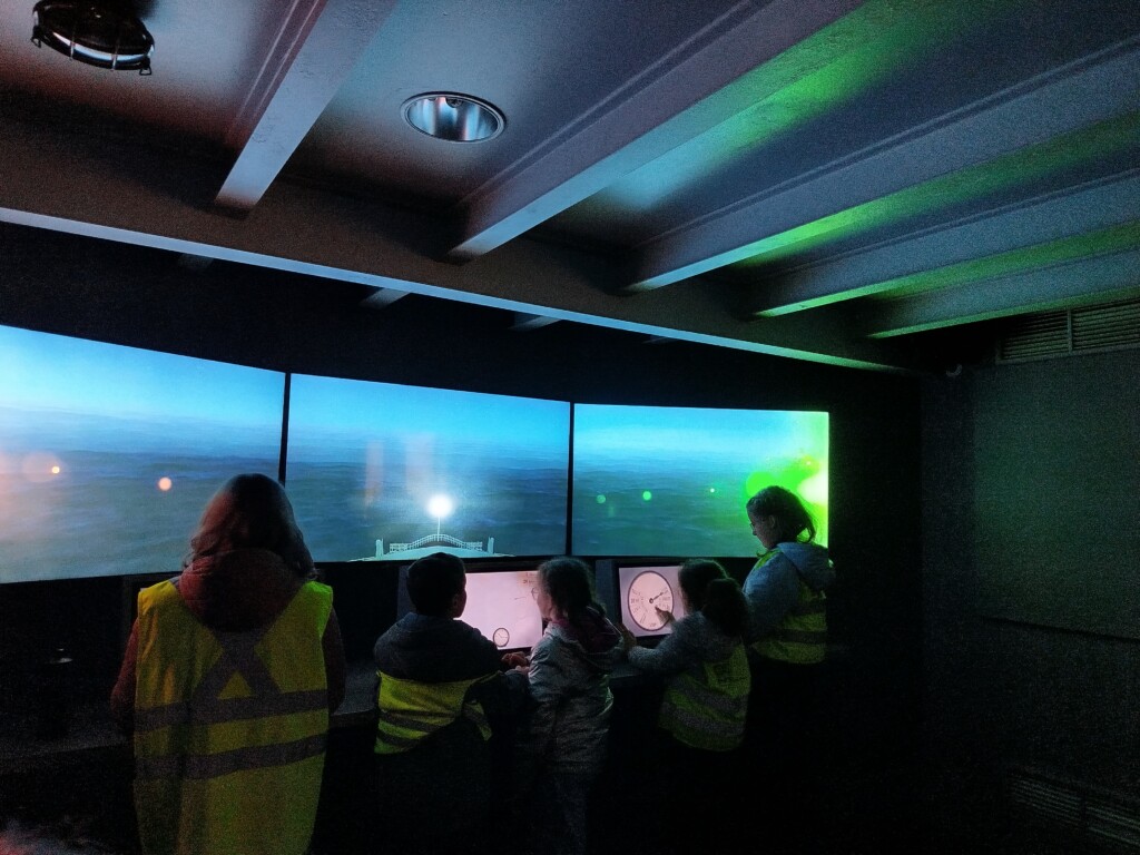 Après notre pique-nique à la base nous nous sommes immergés dans les grands paquebots. Sur le pont nous avons aperçu l’horizon et nous avons essayé le système de messagerie du paquebot et même dirigé le paquebot !